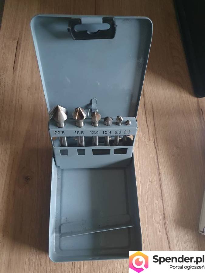 Mam do sprzedania zestaw komplet Pogłębiacze stożkowe - zestaw 6 szt. Średnica nawiercenia :6.3 mm ,8.3 mm,10.4 mm, 12.4 mm, 16.5 mm, 20.5 mm, stan jak na zdjęciu mało używane.