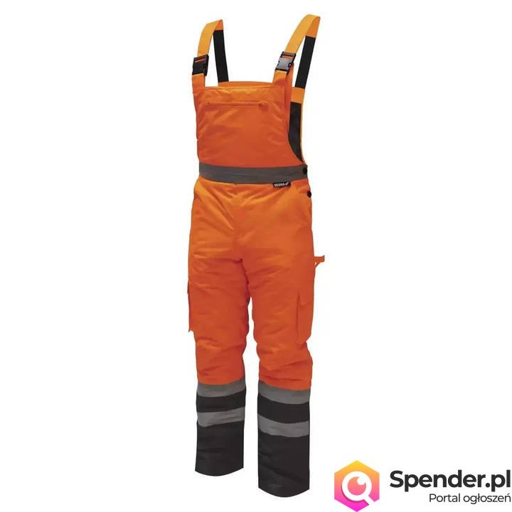 Spodnie ocieplane odblaskowe ogrodniczki są uszyte z tkaniny typu Oxford 300D o gramaturze 180 g/m² . Tkanina zapewnia wiatroszczelność i wodoodporność do 2000mm. Dodatkowo zastosowano wodoszczelne szwy. Od wewnątrz posiadaja pikowane ocieplenie z poliestru o gramaturze 180 g/m² i podszewkę z tafty. Spodnie posiadają gumkę w pasie oraz regulowane szelki z wszytą elastyczną gumą. Rozpinane nogawki ułatwiają wentylację.Praktyczne i funkcjonalne kieszenie oraz szlufka na młotek. W celu zapewnienia widoczności w trudnych warunkach czy po zmroku spodnie posiadają taśmy odblaskowe na nogawkach i dodatkowo w pasie. Taśmy są wklejane w technologii „heat seam” o szerokości 5cm i posiadają certyfikat CE EN20471. Dostępne rozmiary od S do 3XL.
