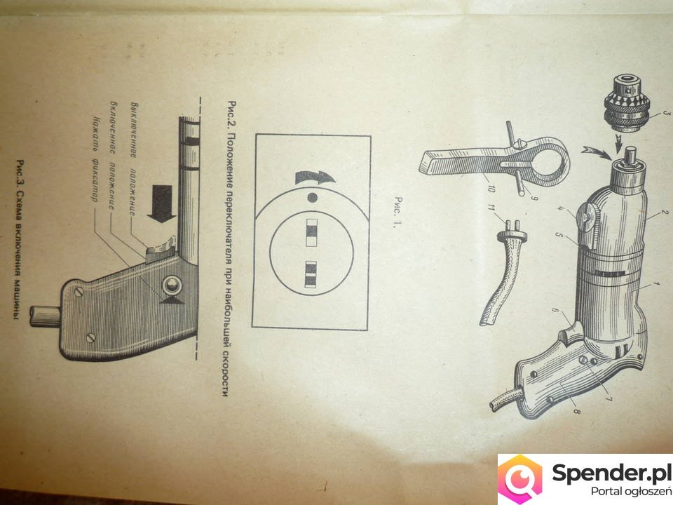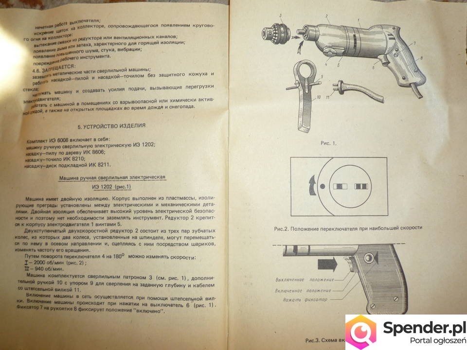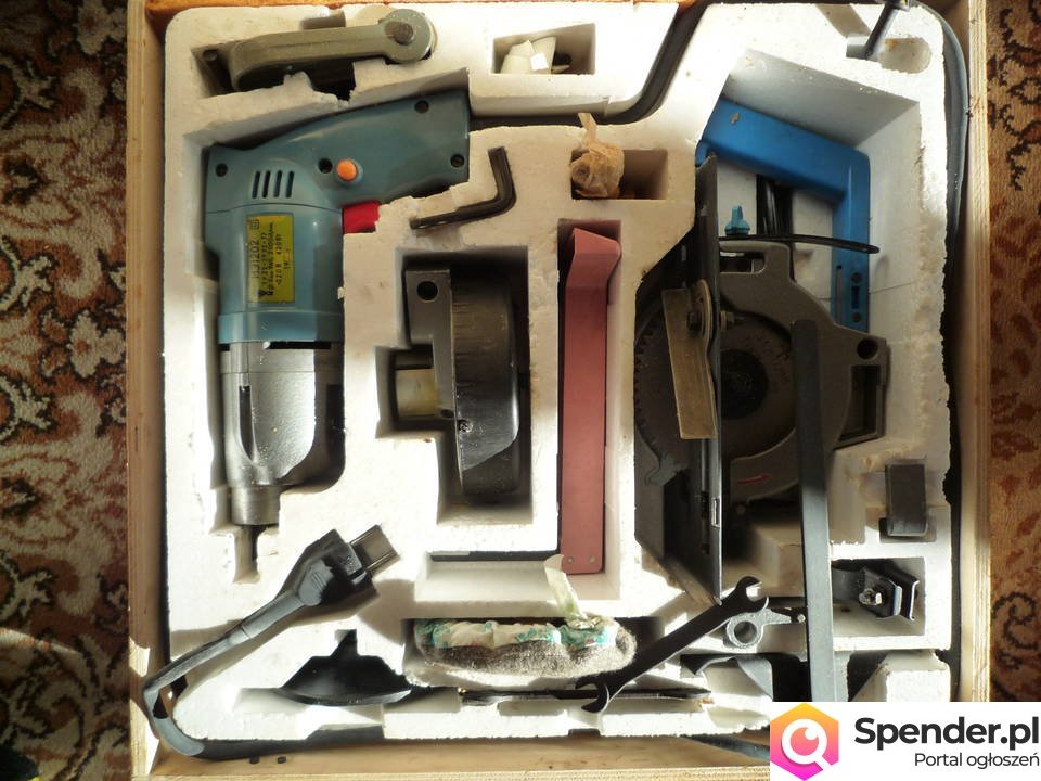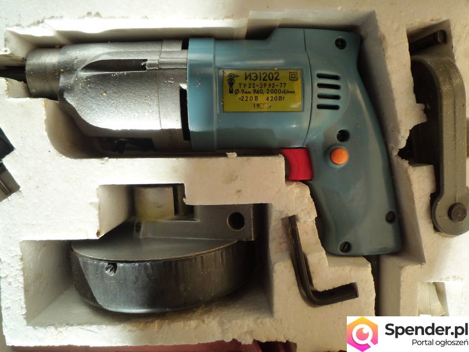 Oferuję wiertarkę z trzema przystawkami tj. piła do drewna, szlifierka, tarcza do wygładzania. Dwie prędkości pracy. W komplecie instrukcja w j. rosyjskim. Wszystko w drewnianej skrzynce wraz z akcesoriami typu wiertła, klucze...
